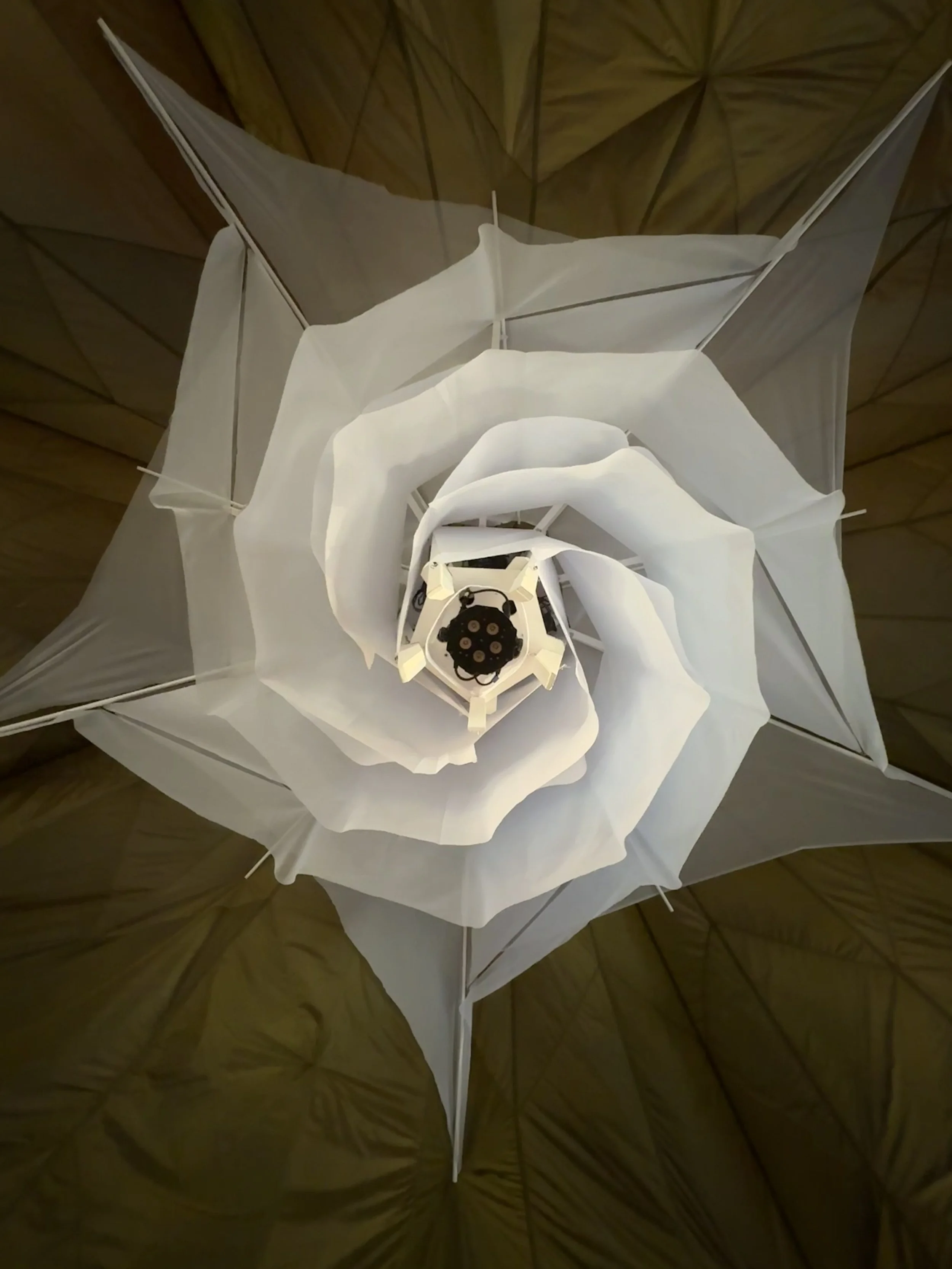 The Pillar is formed from a core of light with ethereal fabric wrapped in layers that shield the light. The layers of fabric allow subtle movement embracing both the permanent presence of God but also his living and active nature. During the day the Pillar will represent cloud, and at night fire.